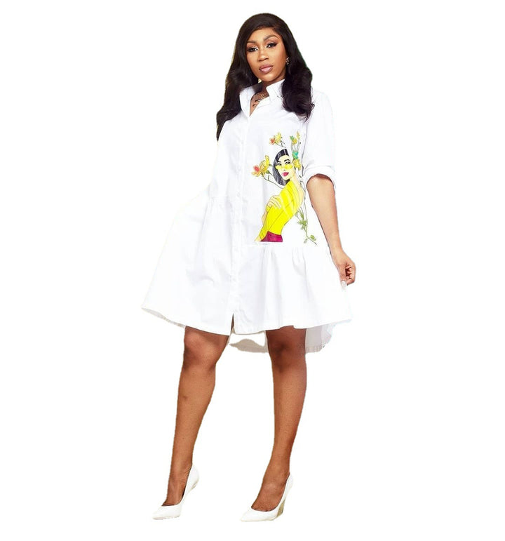 This autumn-style mini dress features a playful cartoon print that adds a refreshing touch to seasonal fashion.