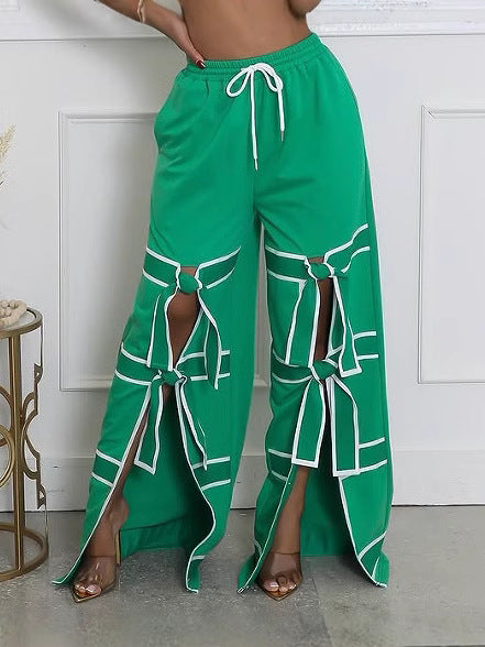 Urban Edge Solid Color Patchwork Pants Tie Up Detail Straight Leg Casual Streetwear Womens Fashion Bottoms Separate Only