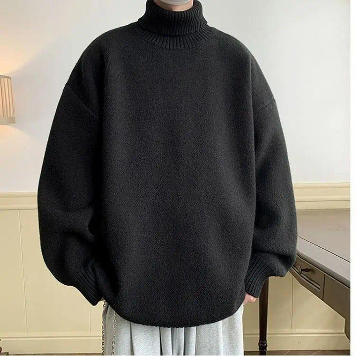 This knitted men’s sweater features a cozy turtleneck and a loose fit, making it ideal for layering during autumn.