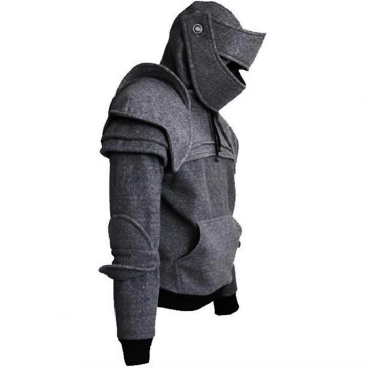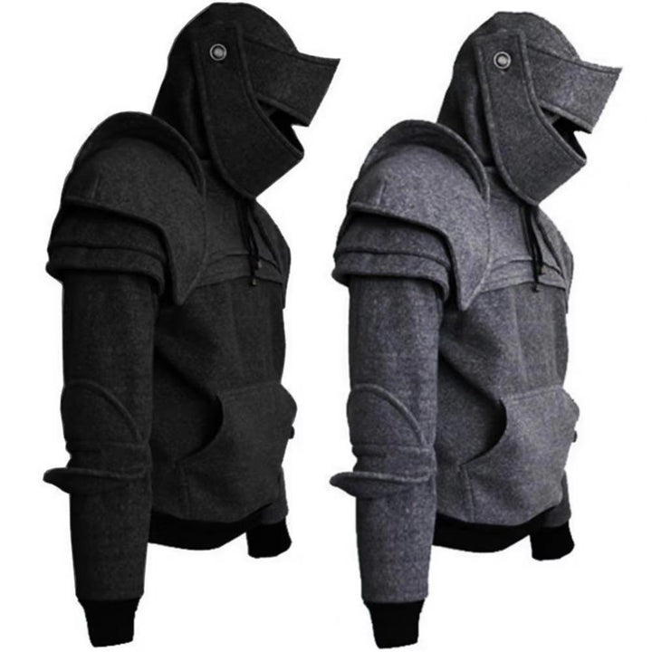 This men's pullover hoodie features a solid color design with a convenient front pocket and a unique medieval-inspired face cover integrated into the hood.