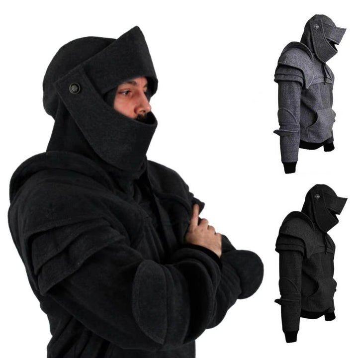 Men Sweatshirt Solid Color Front Pocket Pullover Hoodie Medieval Style Face Cover Hooded Knight Sweatshirt Halloween Clothing