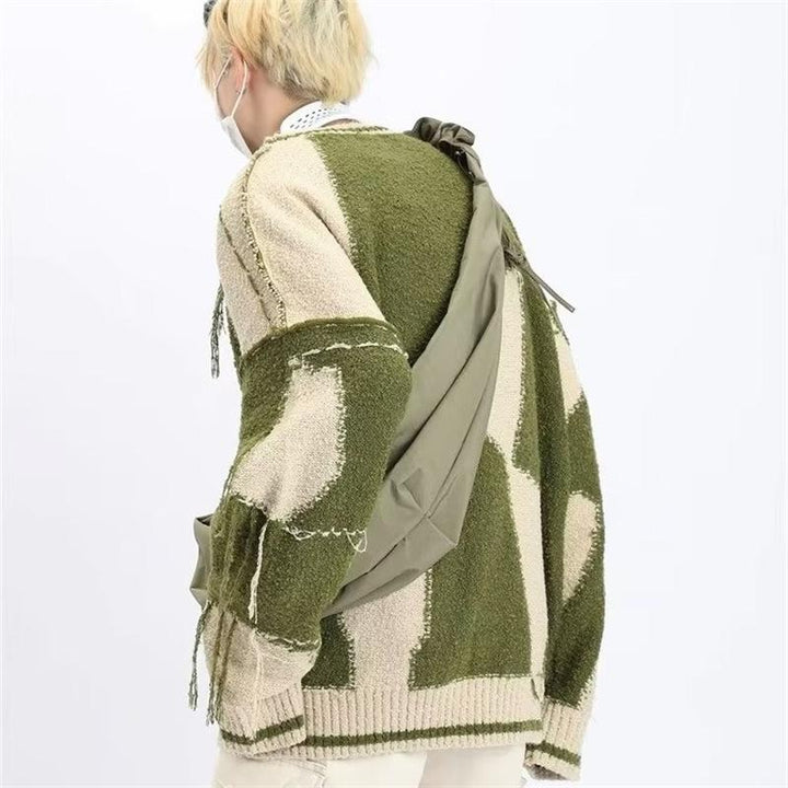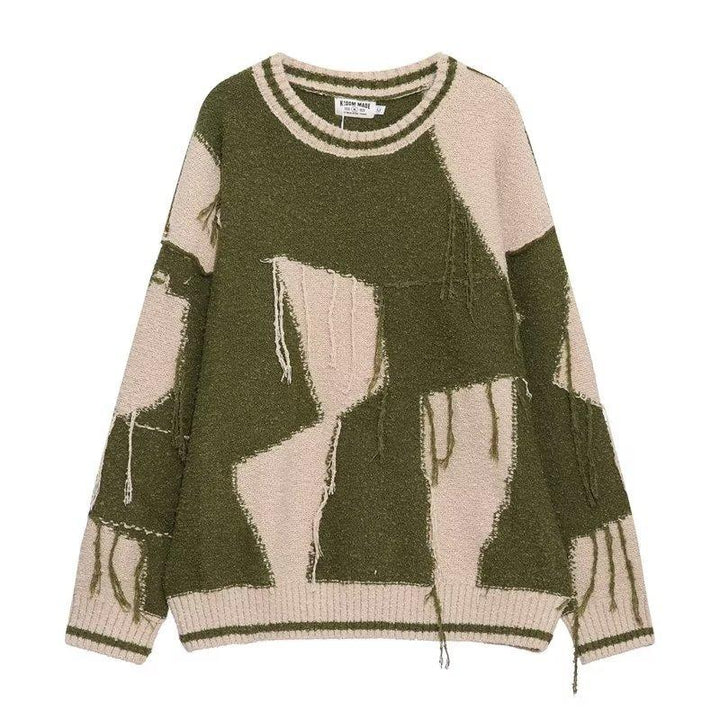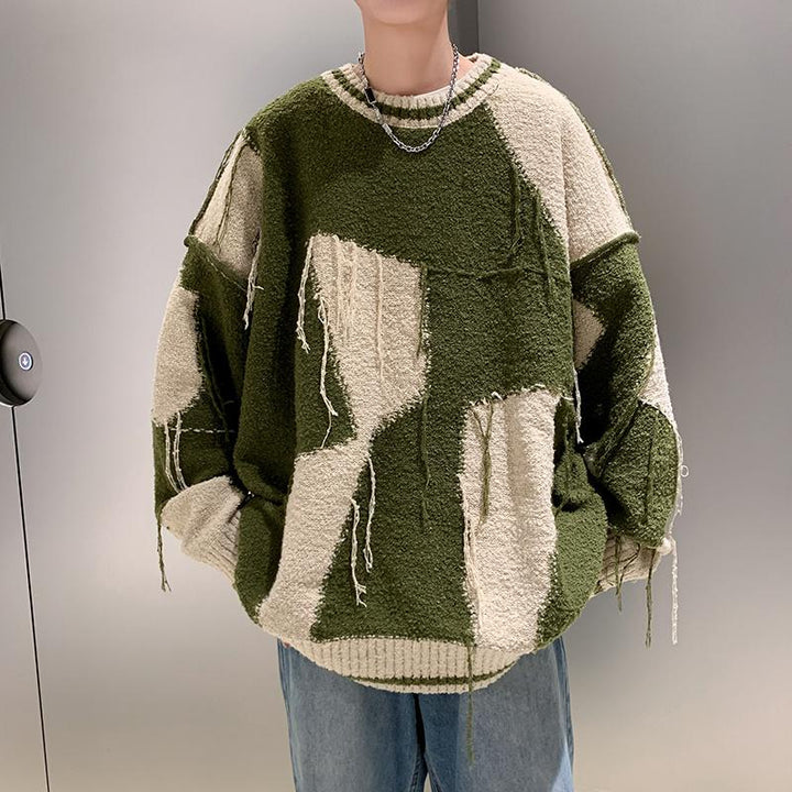 Crafted with patchwork knitwear techniques, it delivers comfortable wear while showcasing a trendy, distressed design.