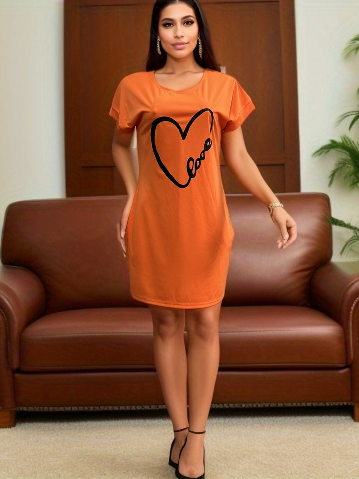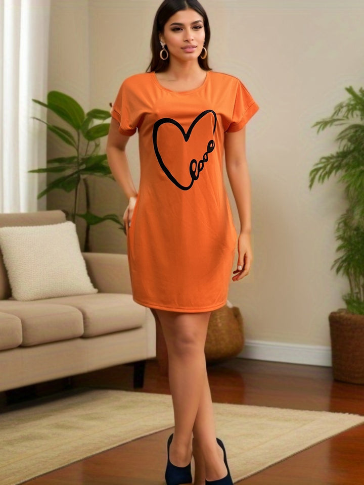 This loose dress features a solid color base adorned with a charming heart print, combining simplicity with a playful touch.