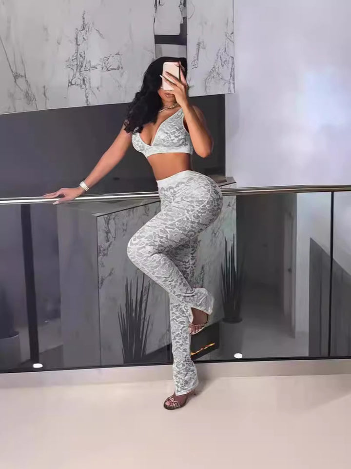 This women's two-piece set combines sensual lace fabric with a design that highlights feminine elegance.